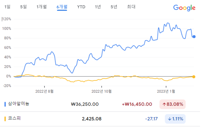 6개월 누적 수익률은 31일 종가 기준으로 진에어가 25.99%이고, 코스피가 -1.11%이다.