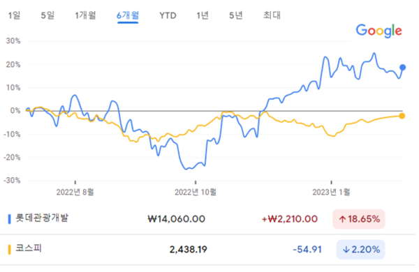 지난 6개월 누적 수익률은 6일 종가 기준으로 롯데관광개발이 18.65%이고 코스피가 -2.20%이다. 목표주가는 IBK투자증권이 1만9000원을, SK증권이 2만5000원을 각각 제시했다.