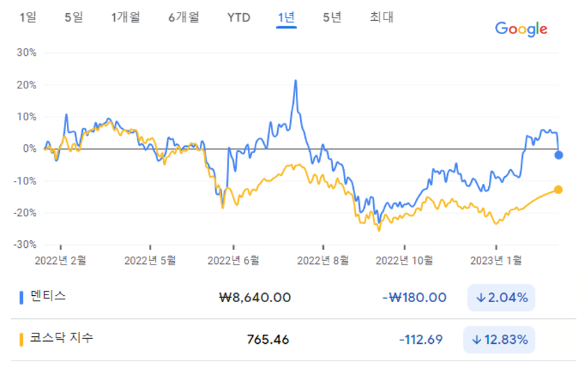 덴티스는 세라핀의 미국, 유럽 시장에서 인증을 받으면 올해 의미 있는 매출이 발생할 것을 기대한다. 15일 종가 기준으로 지난 1년 수익률은 덴티스가 -2.40%, 코스닥이 -12.83%를 기록했다.