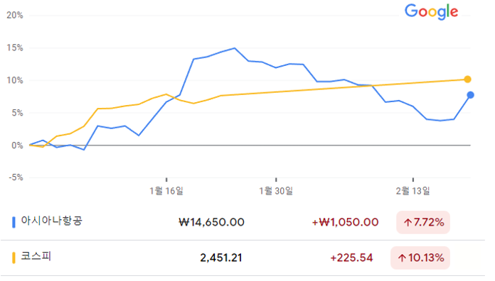 올해 누적 수익률(YTD)은 아시아나항공이 7.72%이고, 코스피는 10.13%이다.