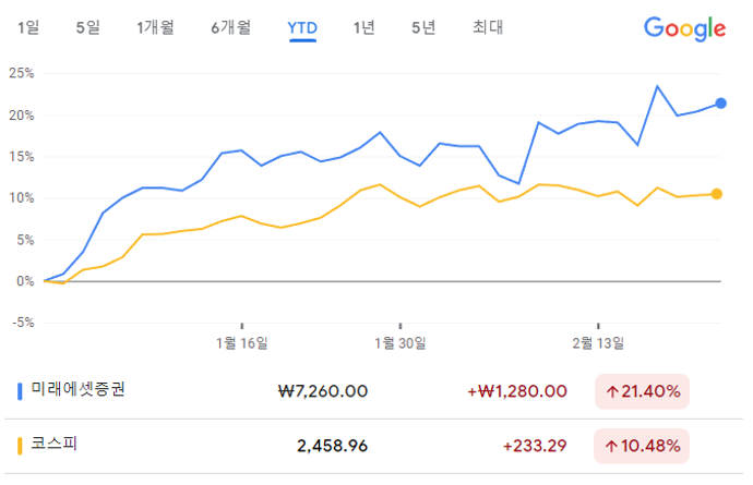 미래에셋증권의 목표주가로 교보증권은 9000원을, 대신증권은 8000원을 각각 제시했다. 올해 누적 수익률(YTD)은 코스피가 10.48%이고, 미래에셋증권이 21.40%이다.