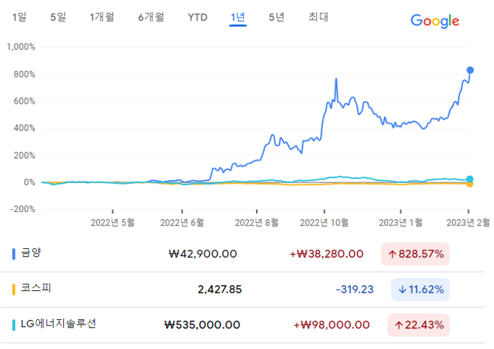 덕분에 지난 1년간 금양의 주가는 2일 종가 기준으로 828.57% 상승했다. 이 기간 코스피 상승률은 -11.62%, 대장주인 LG에너지솔루션은 22.43% 상승했다.