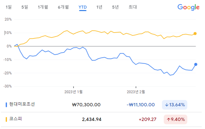 현대미포조선의 목표주가로 한국투자증권은 11만원을, 한화투자증권은 12만원을 각각 제시했다. 올해 누적 수익률(YTD)은 28일 종가 기준으로 현대미포조선이 -13.64%, 코스피가 9.40%이다.