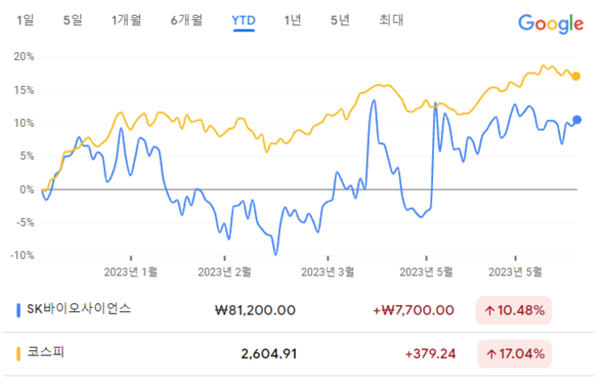 올해 수익률(YTD)은 SK바이오사이언스가 10.48%이고, 코스피가 17.04%이다. SK바이오사이언스의 목표 주가는 NH투자증권이 7만2000원을, DB금융투자가 7만5000원을 각각 제시했다.