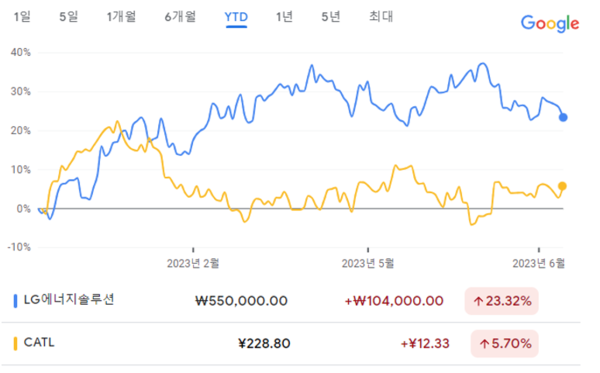 LG에너지솔루션의 목표 주가로 NH투자증권은 77만원을, 한화투자증권은 73만원을, 삼성증권은 74만원을 각각 제시했다. 올해 수익률(YTD)은 10일 종가 기준으로 LG에너지솔루션이 23.32%, 중국의 CATL이 5.70%를 각각 기록했다.