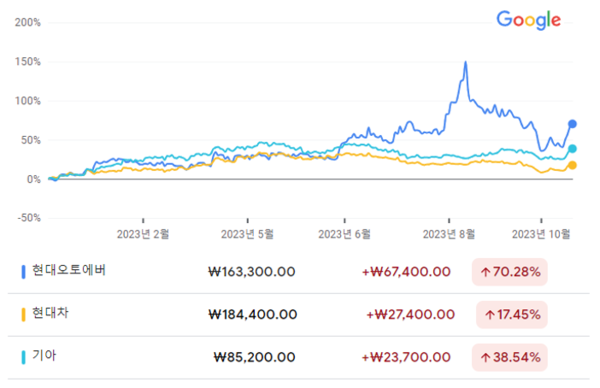 현대오토에버의 올해 수익률도 좋다. 17일 종가 기준으로 YTD가 현대오토에버는 70.28%, 현대착 17.45%를, 기아가 38.54%를 각각 기록했다.