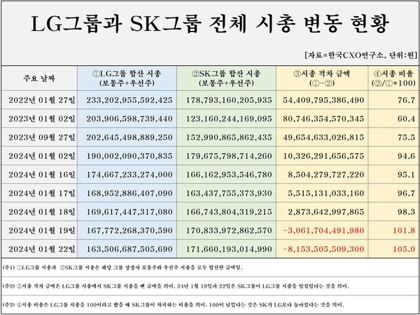 한국CXO연구소 'SK와 LG 그룹 간 시총 2~3위 순위 변동' 발표