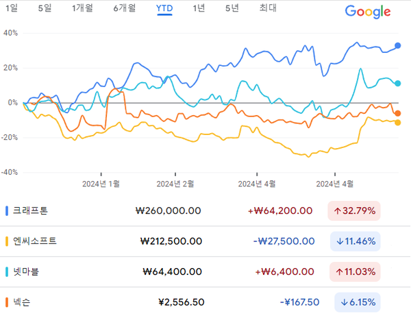 호실적은 주가로도 나타났다. 지난 24일 기준 올해 수익률(YTD)은 크래프톤이 32.79%, 엔씨소프트가 -11.46%, 넷마블이 11.03%, 넥슨이 -6.15%를 각각 기록했다.