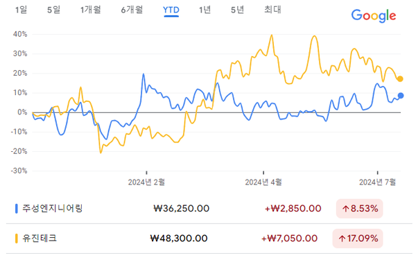 11일 종가 기준으로 올해 수익률(YTD)은 주성엔지니어링이 8.53%, 유진테크가 17.09%를 각각 기록했다.