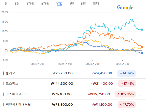 지난 21일 종가 기준으로 올해 수익률(YTD)은 클리오가 -14.74%, 코스맥스가 17.41%, 코스메카코리아가 109.35%, 씨앤씨인터내셔널이 17.70%이다.