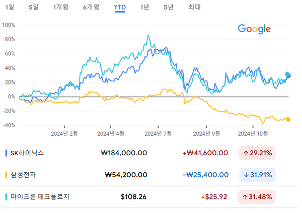 SK하이닉스는 지난 17일 종가 기준으로 올해 수익률이 29.21%이다. 삼성전자는 -31.91%, 마이크론은 31.49%를 각각 기록했다.