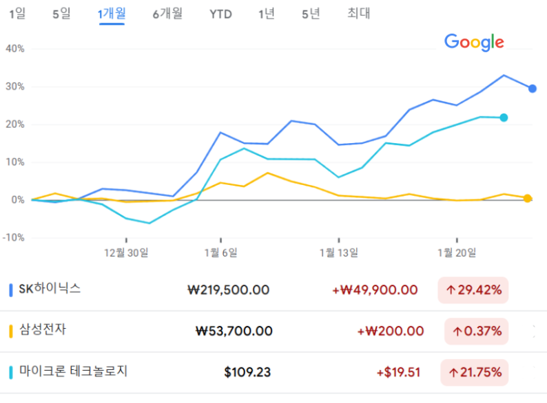 지난 23일 종가 기준으로 지난 한 달 수익률은 SK하이닉스가 29.42%, 삼성전자가 0.37%, 마이크론이 21.75%를 각각 기록했다. 지난해 12·3 계엄 사태로 국내 증시가 추락했지만, SK하이닉스는 경쟁자들을 압도했다.