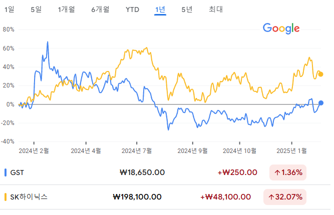이런 액침 냉각 기술로 GST가 지난해부터 시장의 주목을 받았다. 주가 흐름 역시 이를 입증한다. GST와 SK하이닉스의 주가가 동조화했다는 점을 알 수 있다.