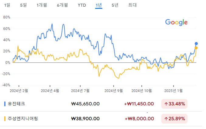 19일 종가 기준으로 1년 수익률은 유진테크가 33.48%, 주성엔지니어링이 25.49%를 각각 기록했다.