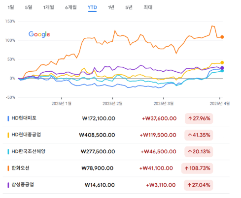 2일 KRX 종가 기준 올해 수익률(YTD)은 HD현대미포조선이 27.96%. HD현대중공업이 41.35%, HD한국조선해양이 20.13%, 한화오션이 108.73%, 삼성중공업이 27.04%를 각각 기록했다.