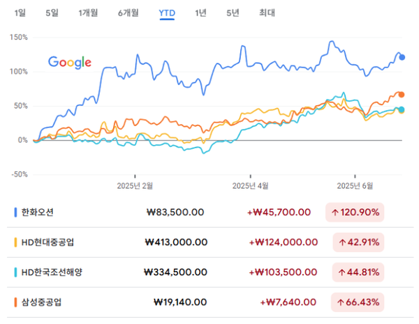 지난 23일 한국거래소 종가 기준으로 올해 수익률(YTD)은 한화오션이 122.90%, HD현대중공업이 42.91%, HD한국조선해양이 44.81%, 삼성중공업이 66.43%를 각각 기록했다.