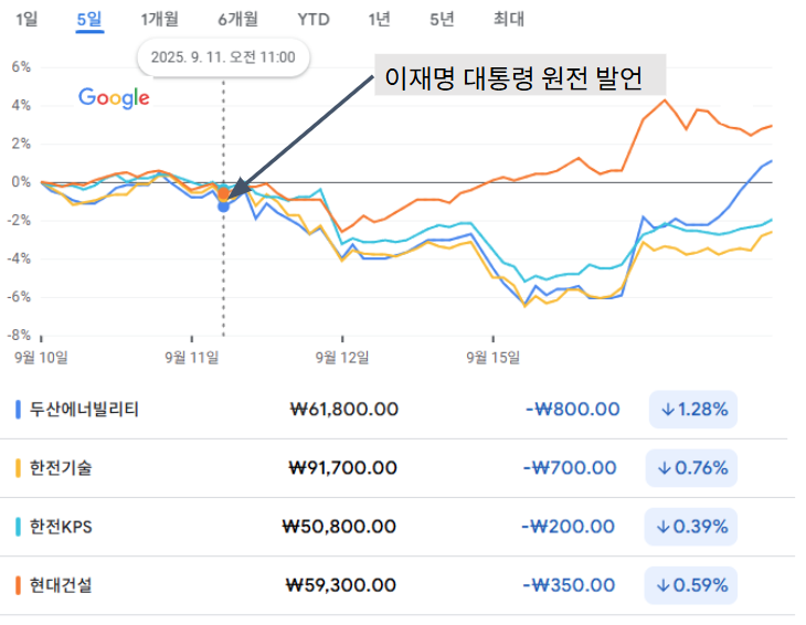 이런 기조에서 벗어난 이 대통령의 11일 발언으로 원전 업종은 투자심리가 냉각됐다. 발언이 알려진 이날 오전11시부터 두산에너빌리티를 비롯한 한전KPS, 한전기술, 현대건설 등은 일제히 하락했다.