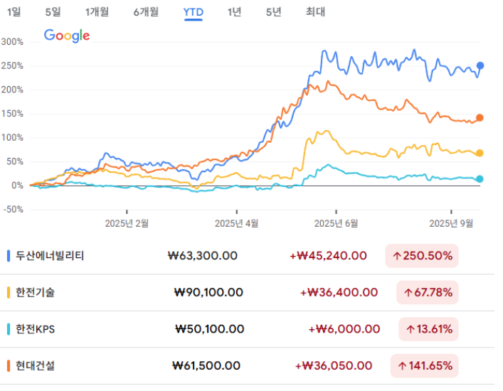 이날까지 올해 수익률(YTD)은 두산에너빌리티 250%, 한전기술 68%, 한전KPS 13.61%, 현대건설이 142%이다.